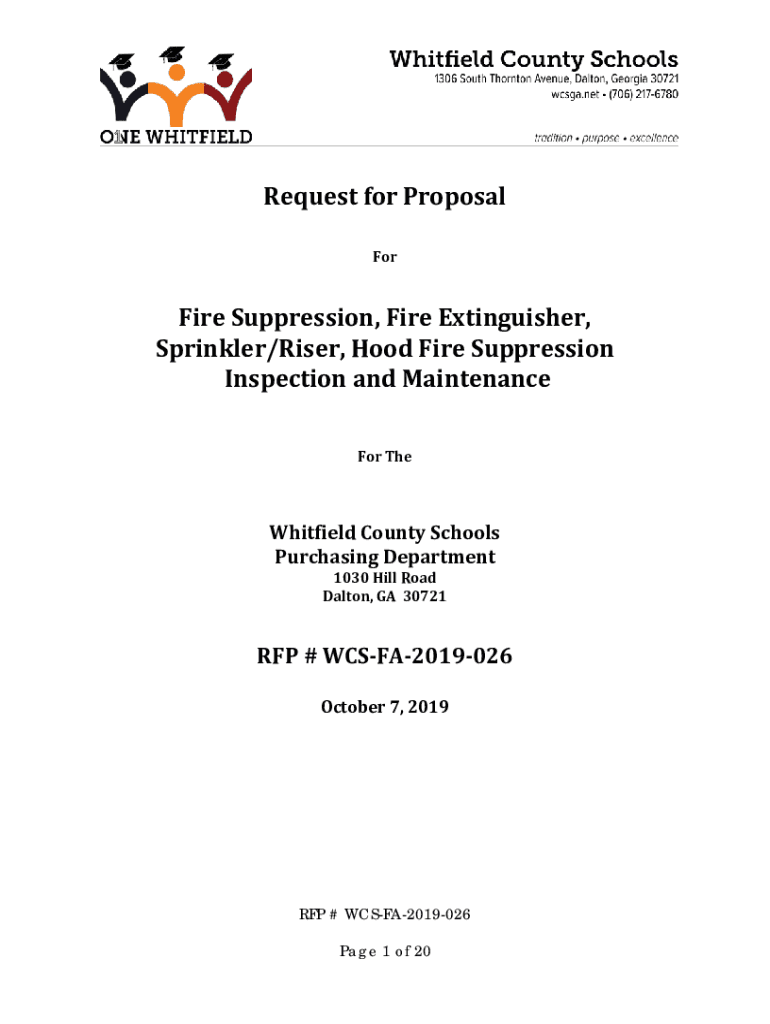 Request for Proposal Foxfire Suppression, Fire Extinguisher, Sprinkler/Riser, Hood Fire Suppression Inspection and Maintenance For The Whitfield County Schools Purchasing Department 1030 Hill Road