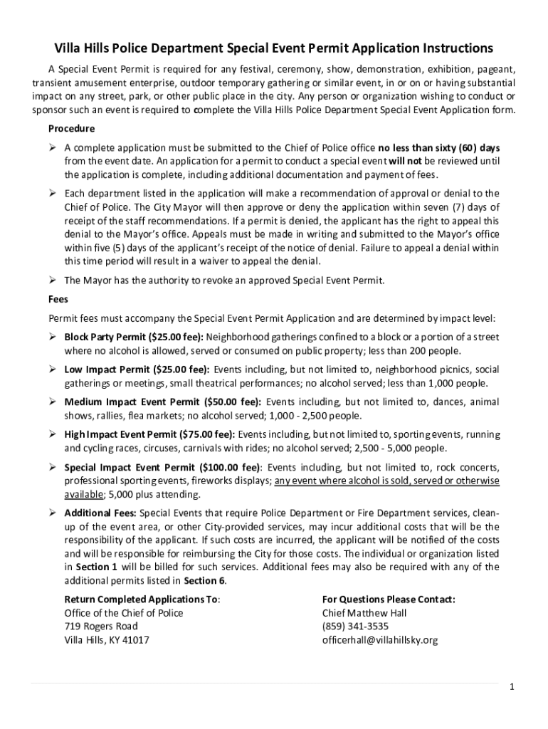 Villa Hills Police Department Special Event Permit Application Instructions A Special Event Permit is required for any festival, ceremony, show, demonstration, exhibition, pageant, transient amusement