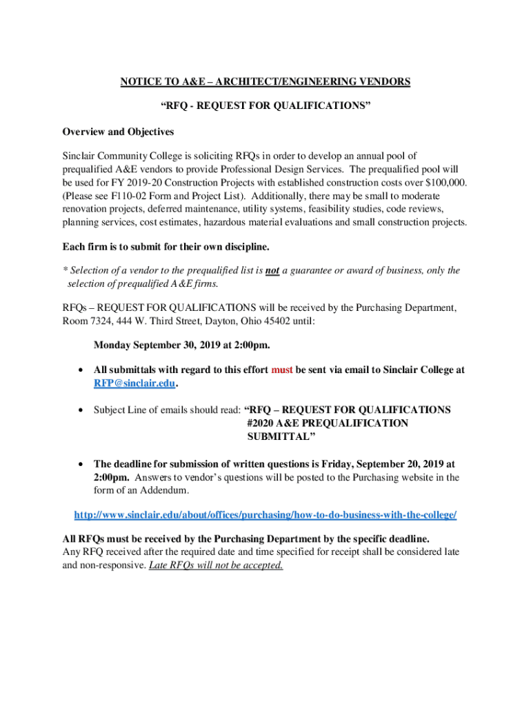 NOTICE TO A&E ARCHITECT/ENGINEERING VENDORS RFQ REQUEST FOR QUALIFICATIONS Overview and Objectives Sinclair Community College is soliciting RFCs in order to develop an annual pool of prequalified