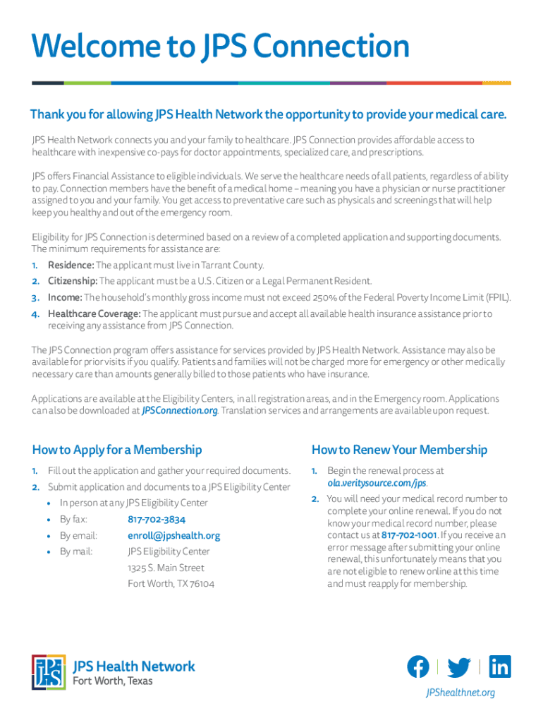 Submit the completed application either online or in person at a JPS Connection Healthcare office.