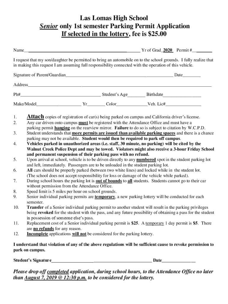 Las Lamas High School Senior only 1st semester Parking Permit Application If selected in the lottery, fee is $25.00 Name___Yr of Grad_2020Permit #___I request that my son/daughter be permitted to