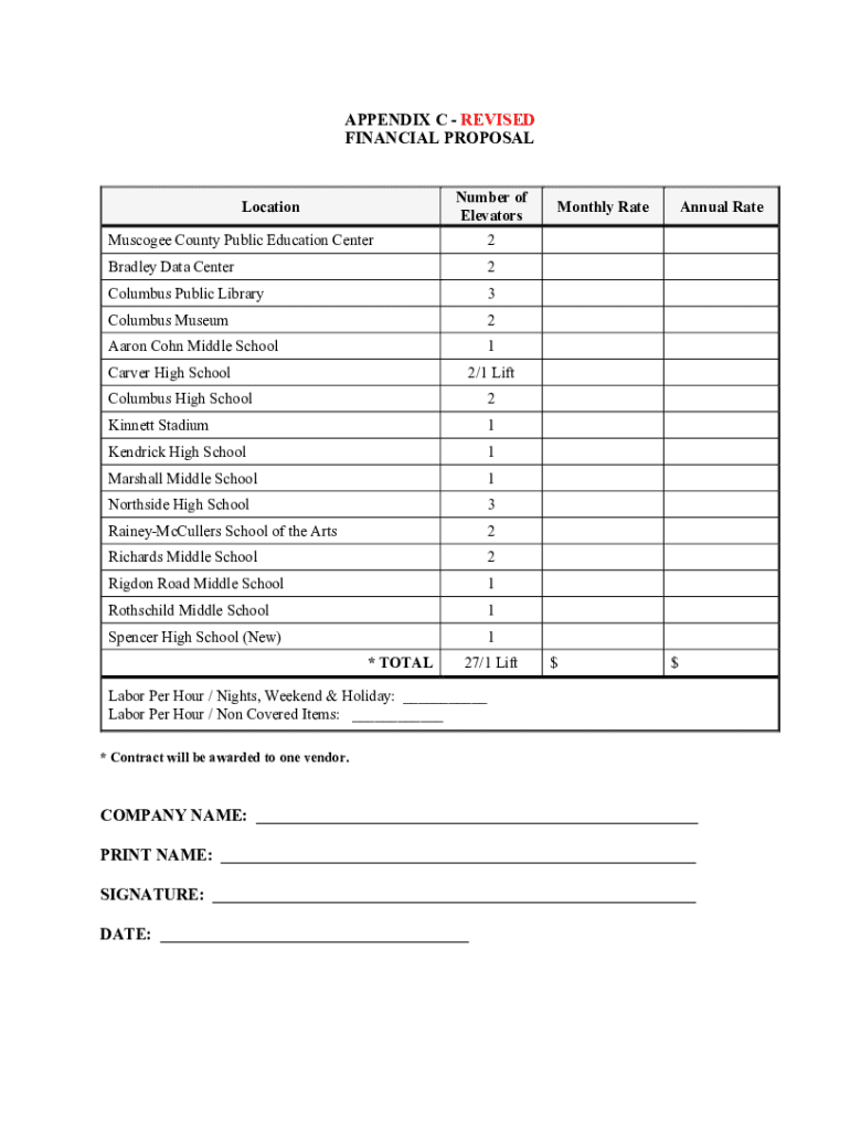 APPENDIX C REVISED FINANCIAL PROPOSAL Number of ElevatorsLocation Muskogee County Public Education Center2Bradley Data Center2Columbus Public Library3Columbus Museum2Aaron Cohn Middle School1Carver