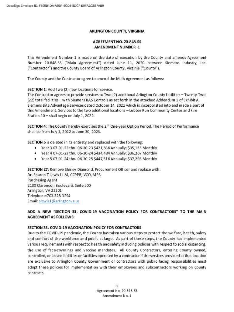DocuSign Envelope ID: F500B1DAA9B14CD18DC7E9FABC837AB9ARLINGTON COUNTY, VIRGINIA AGREEMENT NO. 20848SS AMENDMENT NUMBER 1 This Amendment Number 1 is made on the date of execution by the County and