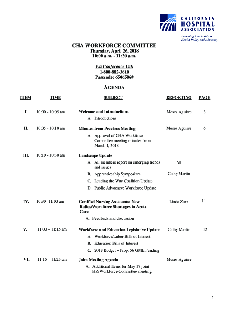 CIA WORKFORCE COMMITTEE Thursday, April 26, 2018 10:00 a.m. 11:30 a.m. Via Conference Call 18008823610 Passcode: 6506506#A AGENDA ITEM I.TIME 10:00 10:05 subject Welcome and IntroductionsREPORTINGPAGEMoses