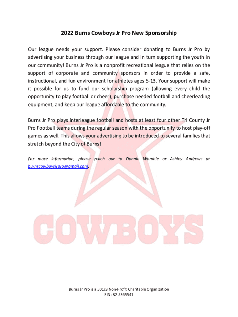 2022 Burns Cowboys Jr Pro New Sponsorship Our league needs your support. Please consider donating to Burns Jr Pro by advertising your business through our league and in turn supporting the youth in