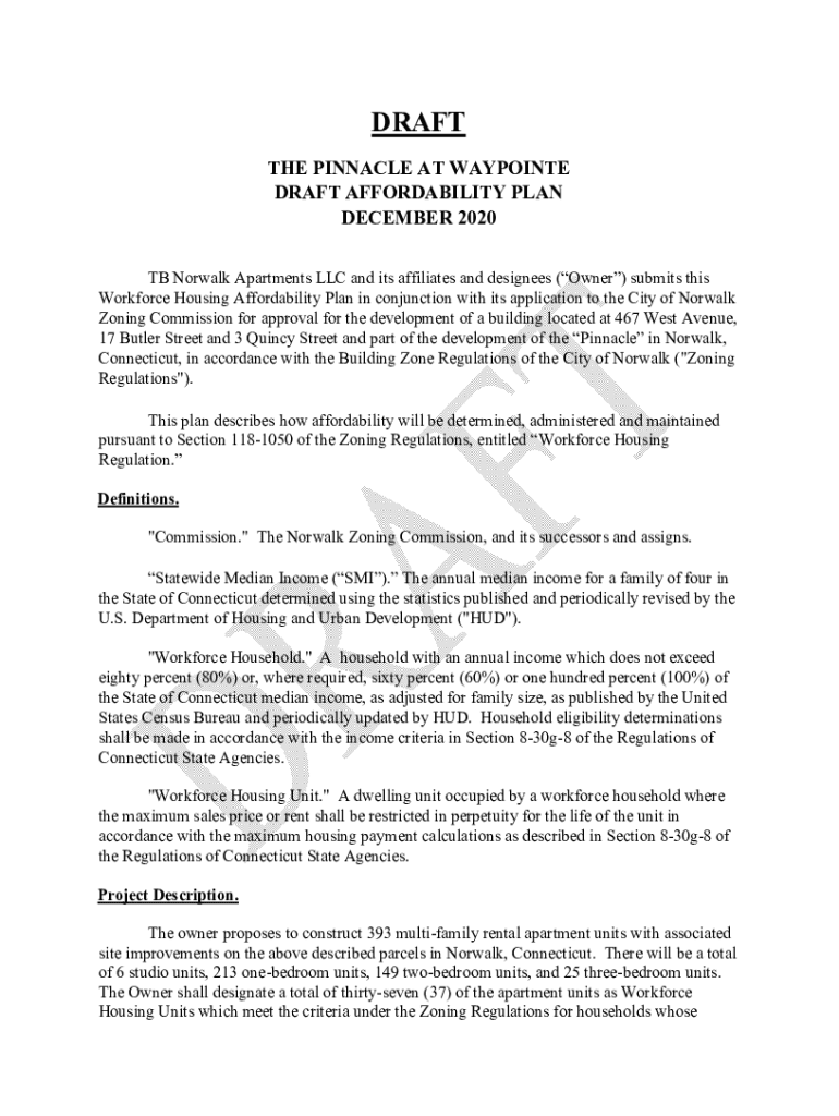 DRAFT THE PINNACLE AT WAYPOINT DRAFT AFFORDABILITY PLAN DECEMBER 2020 TB Norwalk Apartments LLC and its affiliates and designees (Owner) submits this Workforce Housing Affordability Plan in conjunction