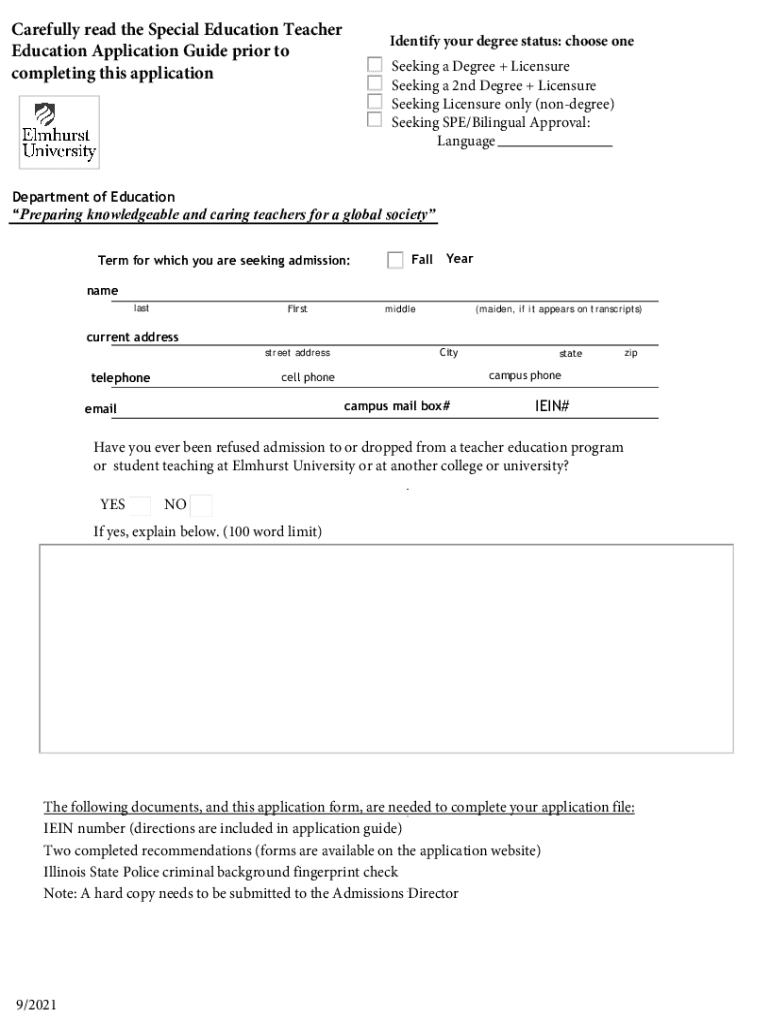 Carefully read the Special Education Teacher Education Application Guide prior to completing this applicationIdentify your degree status: choose one Seeking a Degree + Licensure Seeking a 2nd Degree