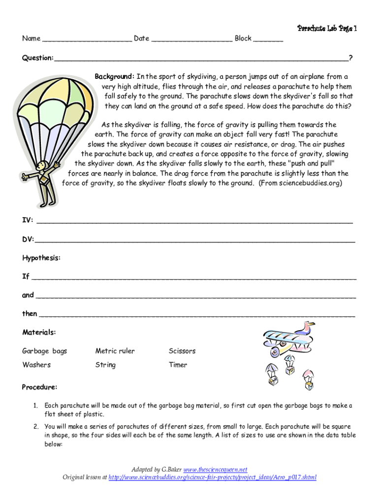 Parachute Lab Page 1 Name ___ Date ___ Block ___ Question:___? Background: In the sport of skydiving, a person jumps out of an airplane from a very high altitude, flies through the air, and releases