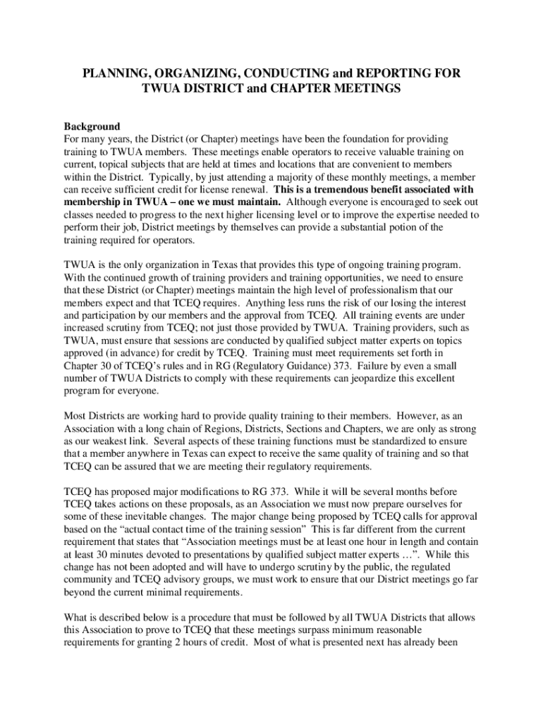 PLANNING, ORGANIZING, CONDUCTING and REPORTING FOR TWA DISTRICT and CHAPTER MEETINGS Background For many years, the District (or Chapter) meetings have been the foundation for providing training to
