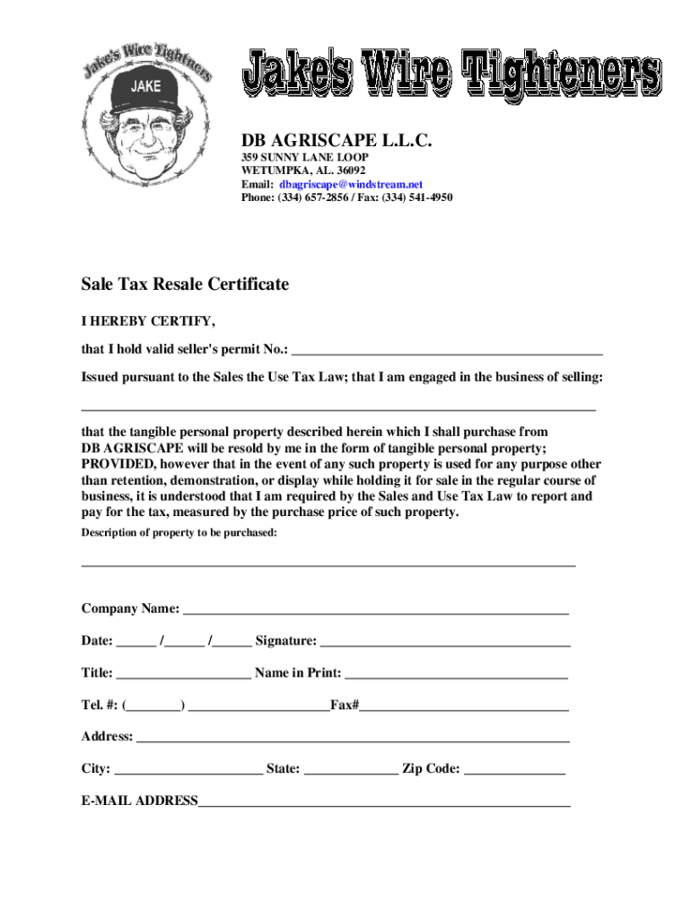 DB PERISCOPE L.L.C. 359 SUNNY LANE LOOP WETUMPKA, AL. 36092 Email: dbagriscape@windstream.net Phone: (334) 6572856 / Fax: (334) 5414950Sale Tax Resale Certificate I HEREBY CERTIFY, that I hold valid