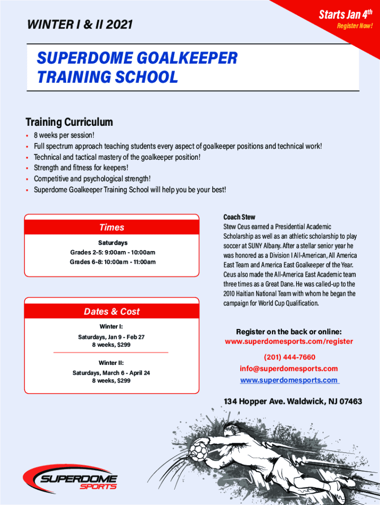 Starts Jan 4thWINTER I & II 2021Register Now!SUPERPOSE GOALKEEPER TRAINING SCHOOL Training Curriculum 8 weeks per session! Full spectrum approach teaching students every aspect of goalkeeper positions