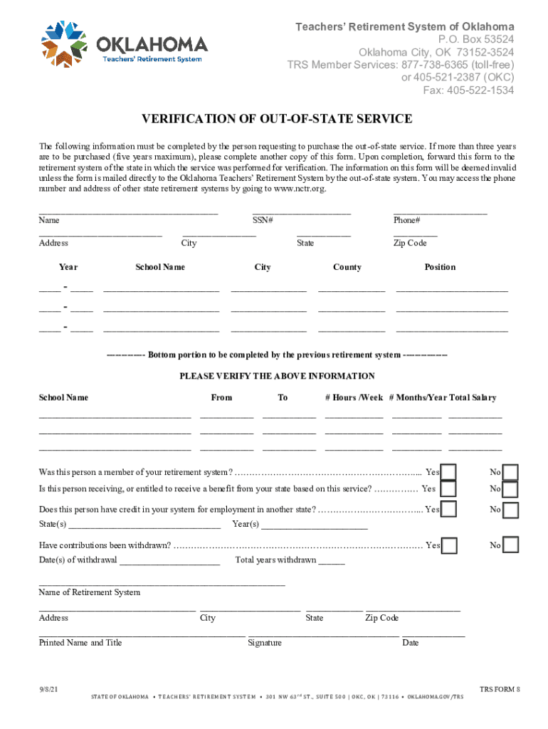 Teachers Retirement System of Oklahoma P.O. Box 53524 Oklahoma City, OK 731523524 TRS Member Services: 8777386365 (toll-free) or 4055212387 (OK) Fax: 4055221534VERIFICATION OF OUTOFSTATE SERVICE The