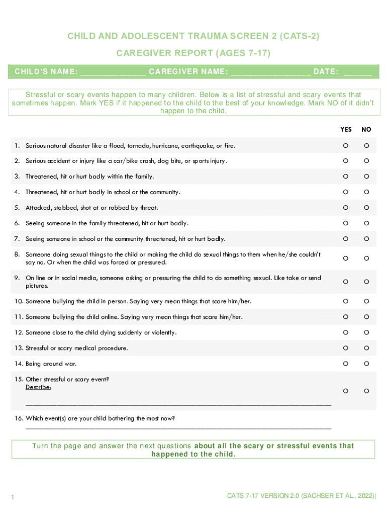 CHILD AND ADOLESCENT TRAUMA SCREEN 2 (CATS2) CAREGIVER REPORT (AGES 717) CHILD NAM E: ___ CAREGIVER NAM E: ___ __ DATE: ___ Stressful or scary events happen to m any children. Below is a list of stressful