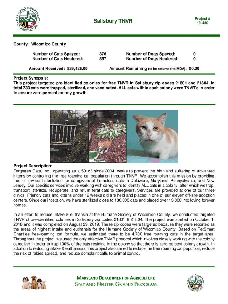 Salisbury TNVRProject # 19430County: Comic County Number of Cats Spayed: Number of Cats Neutered: Amount Received: $29,425.00376 357Number of Dogs Spayed: Number of Dogs Neutered:0 0Amount Remaining
