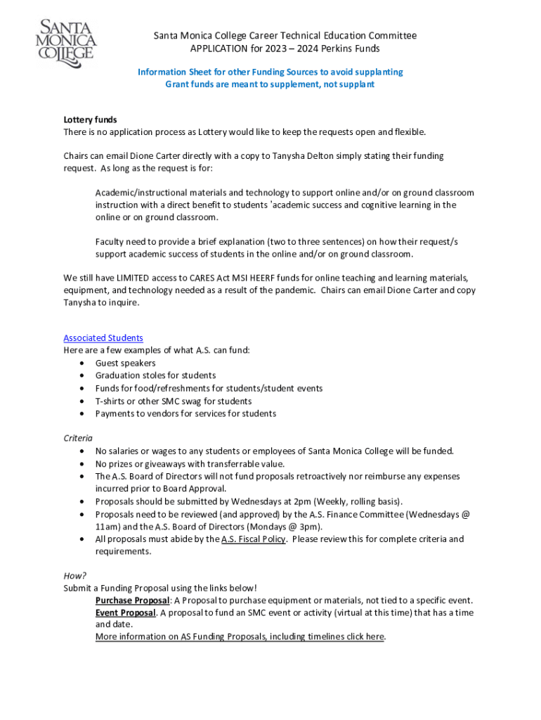 Santa Monica College Career Technical Education Committee APPLICATION for 2023 2024 Perkins Funds Information Sheet for other Funding Sources to avoid supplanting Grant funds are meant to supplement,
