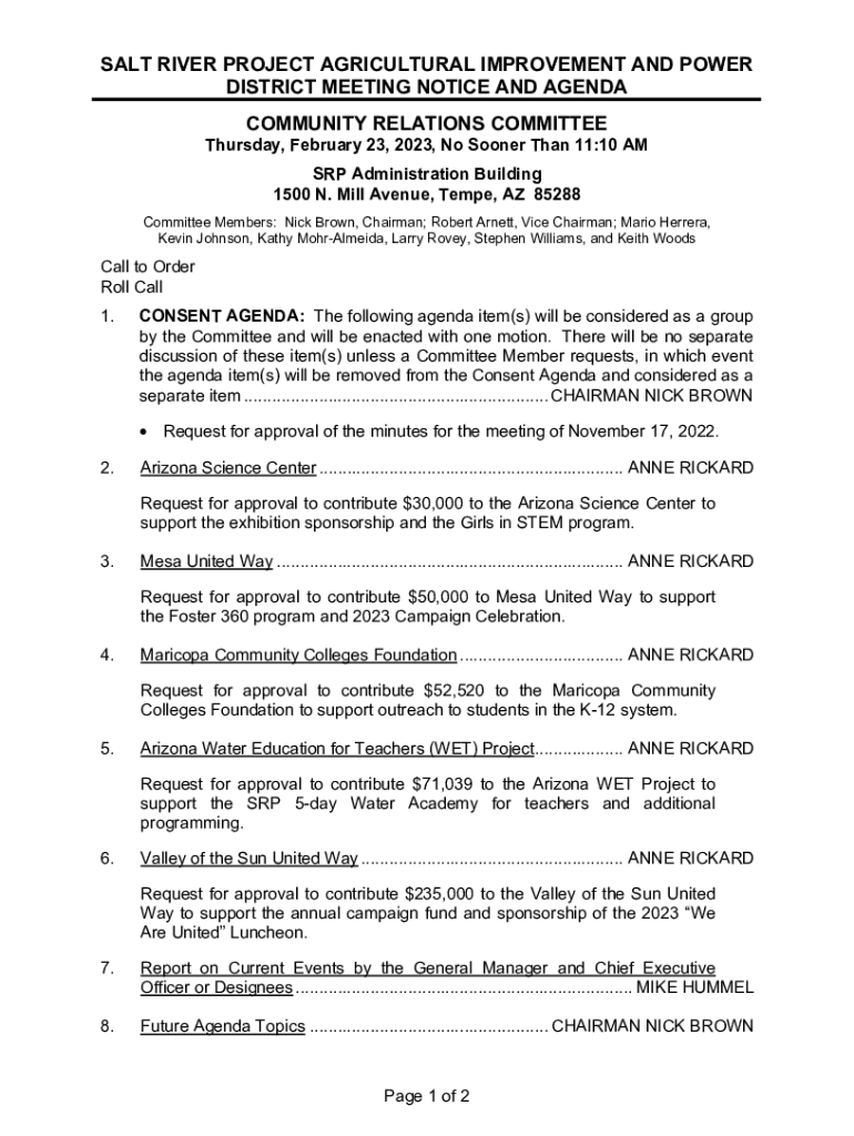 SALT RIVER PROJECT AGRICULTURAL IMPROVEMENT AND POWER DISTRICT MEETING NOTICE AND AGENDA COMMUNITY RELATIONS COMMITTEE Thursday, February 23, 2023, No Sooner Than 11:10 AM SRP Administration Building