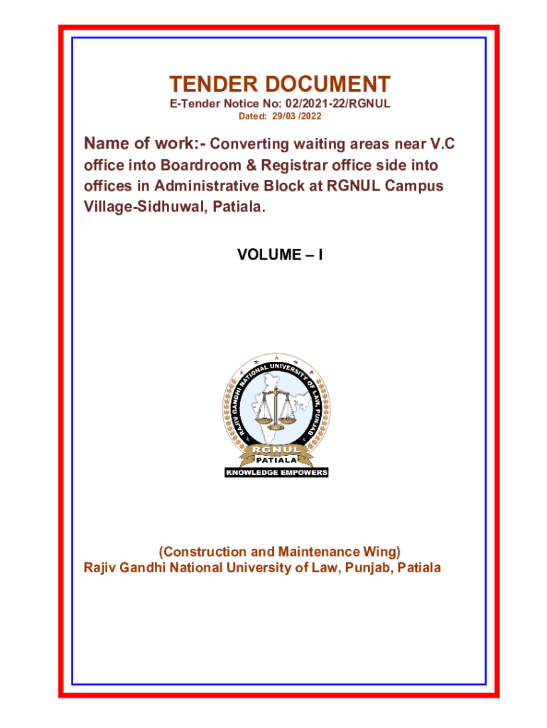 0TENDER DOCUMENT Tender Notice No: 02/202122/RENAL Dated: 29/03 /2022Name of work: Converting waiting areas near V. C office into Boardroom & Registrar office side into offices in Administrative Block