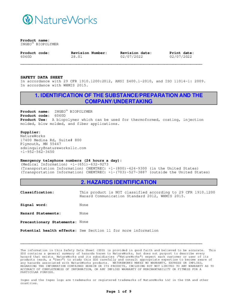 Product name: INGE BIOPOLYMER Product code: 6060DRevision Number: 28.01Revision date: 02/07/2022Print date: 02/07/2022___ SAFETY DATA SHEET In accordance with 29 CFR 1910.1200:2012, ANSI Z400.12010,