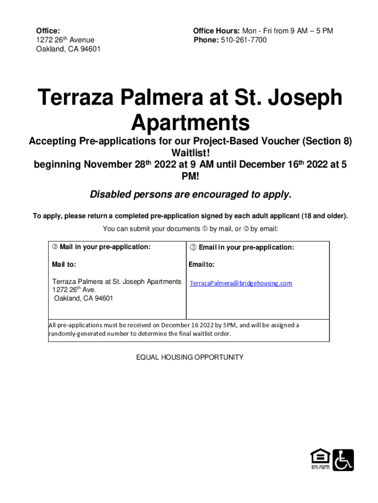 Office Hours: Mon Fri from 9 AM 5 PM Phone: 5102617700Office: 1272 26th Avenue Oakland, CA 94601Terraza Palmer at St. Joseph Apartments Accepting Reapplications for our Projected Voucher (Section