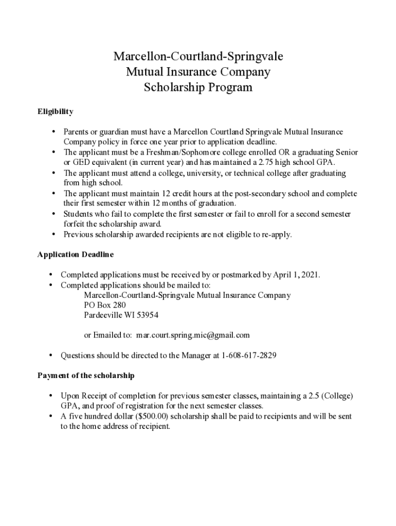 MarcellonCourtlandSpringvale Mutual Insurance Company Scholarship Program Eligibility Parents or guardian must have a Marcello Courtland Springdale Mutual Insurance Company policy in force one year