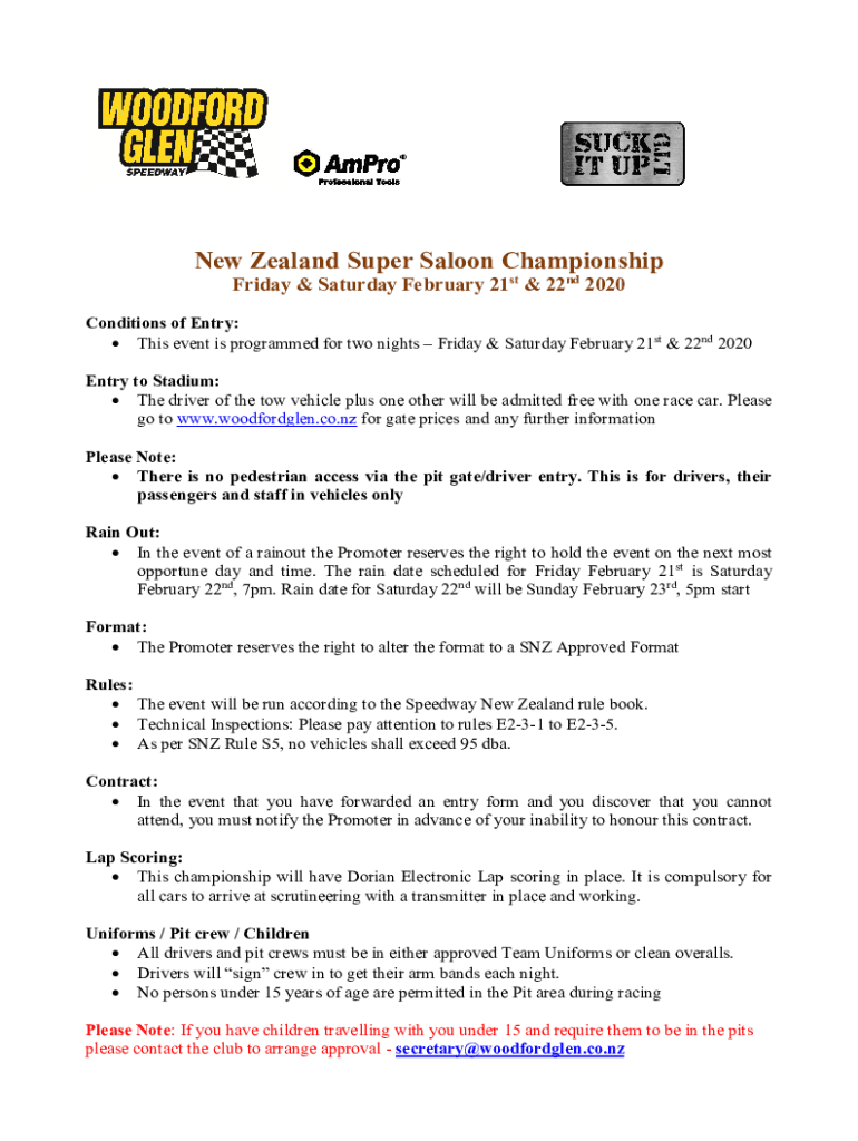 New Zealand Super Saloon Championship Friday & Saturday, February 21st & 22nd 2020 Conditions of Entry: This event is programmed for two nights Friday & Saturday, February 21st & 22nd 2020 Entry to