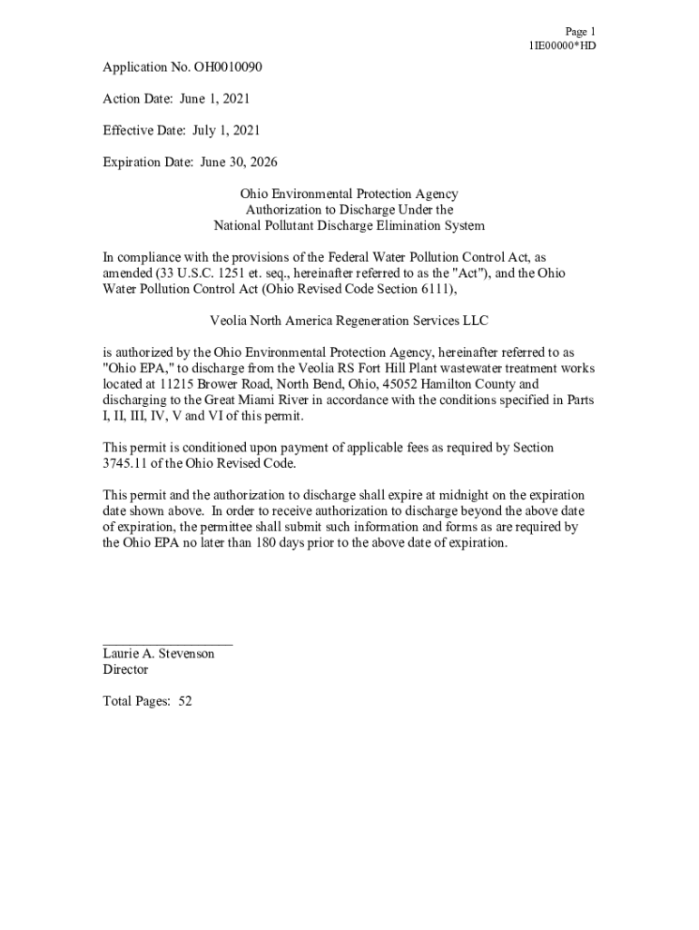 Page 1 1IE00000×Application No. OH0010090 Action Date: June 1, 2021, Effective Date: July 1, 2021, Expiration Date: June 30, 2026 Ohio Environmental Protection Agency Authorization to Discharge Under