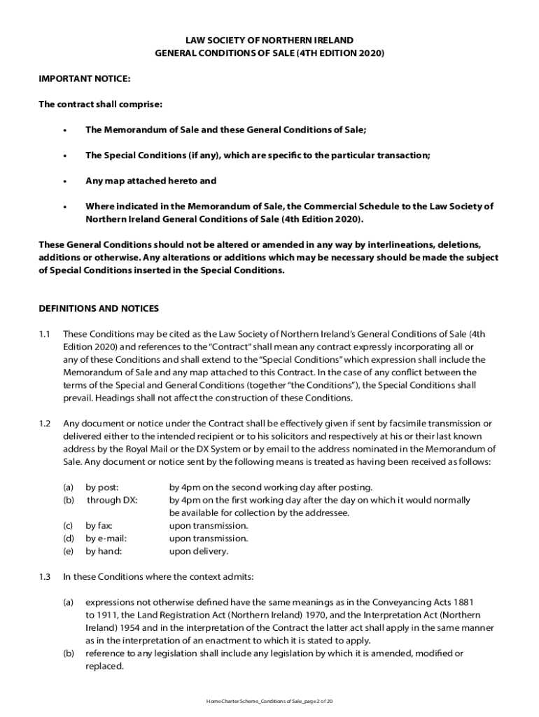 LAW SOCIETY OF NORTHERN IRELAND GENERAL CONDITIONS OF SALE (4TH EDITION 2020) IMPORTANT NOTICE: The contract shall comprise: The Memorandum of Sale and these General Conditions of Sale;The Special