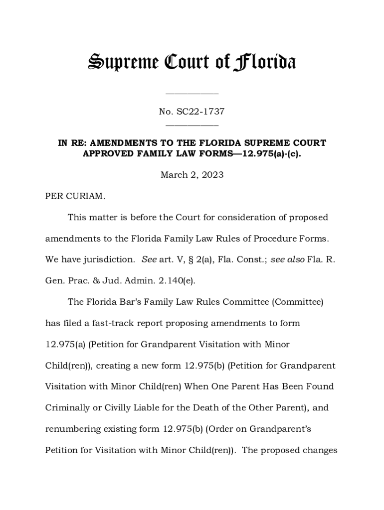 Supreme Court of Florida ___ No. SC221737 ___ IN RE: AMENDMENTS TO THE FLORIDA SUPREME COURT APPROVED FAMILY LAW FORMS12.975(a)(c). March 2, 2023, PER CURIA. This matter is before the Court for consideration