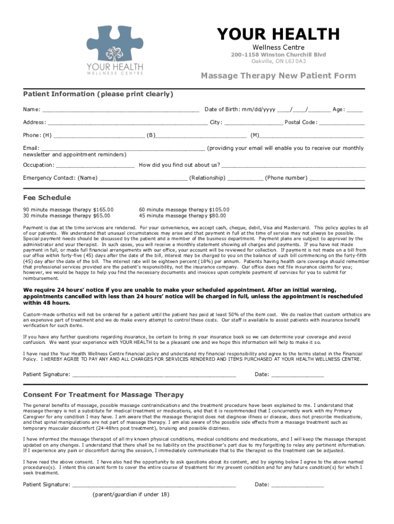 YOUR HEALTH Wellness Center 2001158 Winston Churchill Blvd Oakville, ON L6J 0A3Massage Therapy New Patient Form Patient Information (please print clearly) Name: ___Date of Birth: mm/dd/YYY ___/___/___