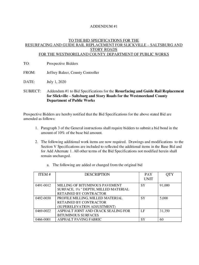 ADDENDUM #1TO THE BID SPECIFICATIONS FOR THE RESURFACING AND GUIDE RAIL REPLACEMENT FOR LIOUVILLE SALISBURY AND STORY ROADS FOR THE WESTMORELAND COUNTY DEPARTMENT OF PUBLIC WORKS TO:Prospective BiddersFROM:Jeffrey