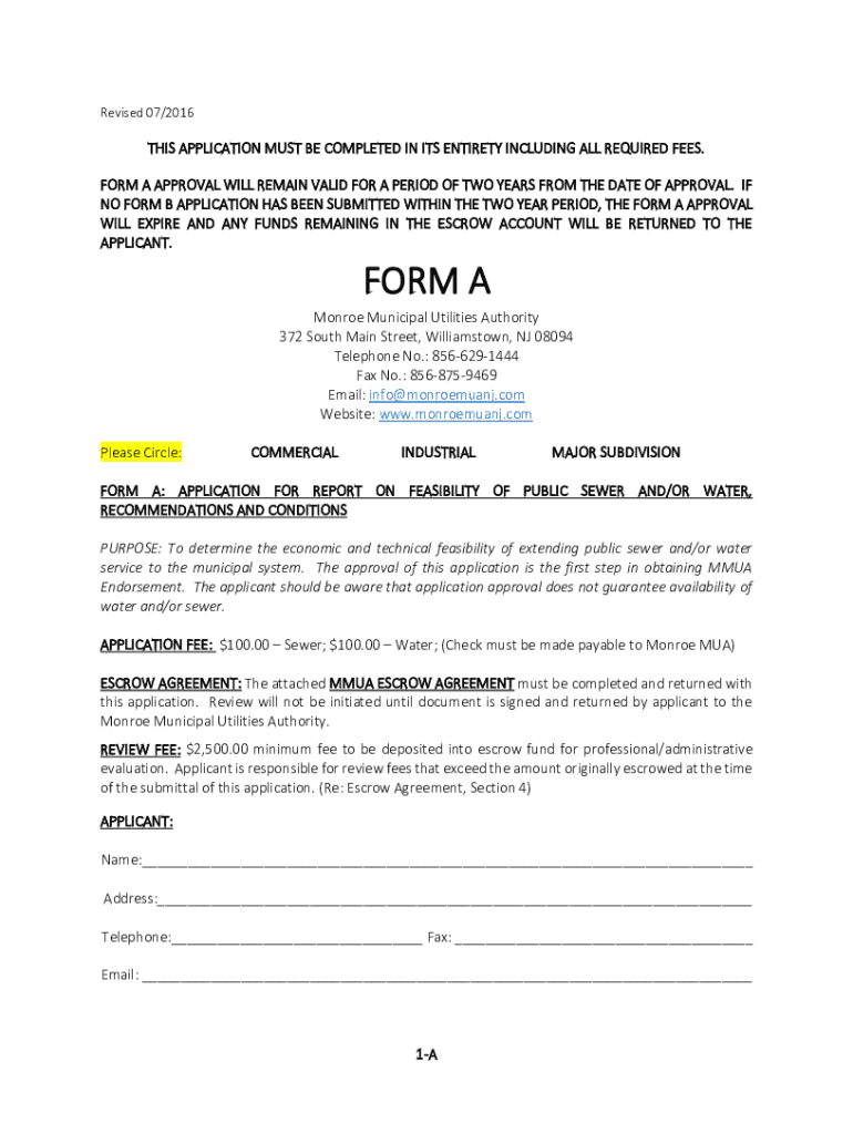 Revised 07/2016THIS APPLICATION MUST BE COMPLETED IN ITS ENTIRETY INCLUDING ALL REQUIRED FEES. FORM A APPROVAL WILL REMAIN VALID FOR A PERIOD OF TWO YEARS FROM THE DATE OF APPROVAL. IF NO FORM B APPLICATION