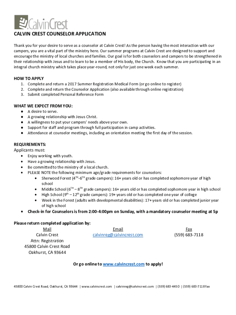 Get the free Apply to Summer Staff - Calvin Crest - Serve. Connect. Grow.