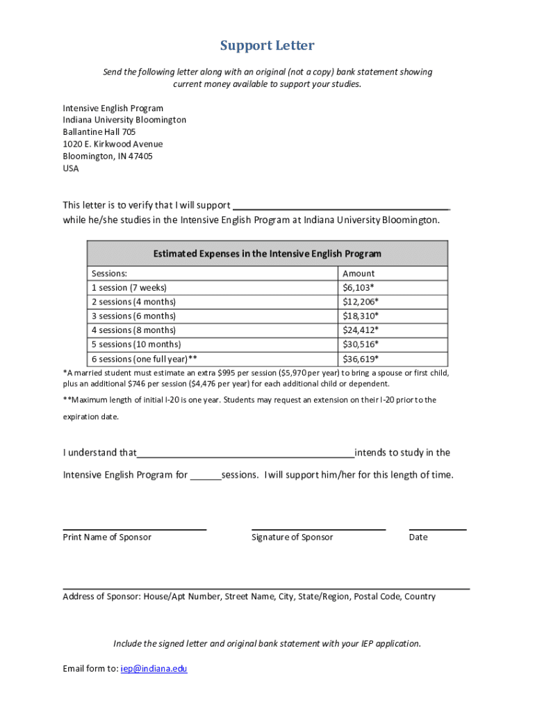 Support Letter Send the following letter along with an original (not a copy) bank statement showing current money available to support your studies. Intensive English Program Indiana University Bloomington