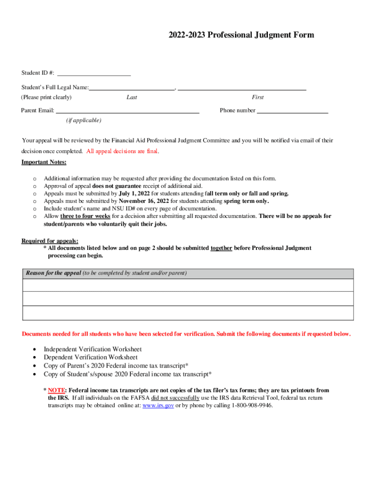 20222023 Professional Judgment FormStudent ID #: Students Full Legal Name: (Please print clearly), Apparent Email:First Phone number(if applicable) Your appeal will be reviewed by the Financial Aid