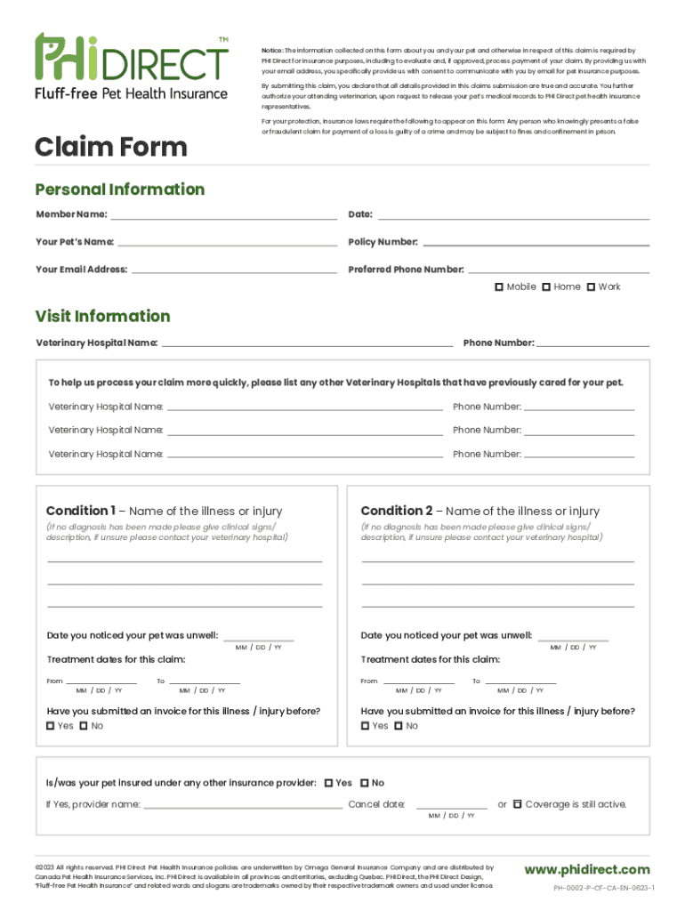 Notice: The information collected on this form about you and your pet and otherwise in respect of this claim is required by PHI Direct for insurance purposes, including to evaluate and, if approved,