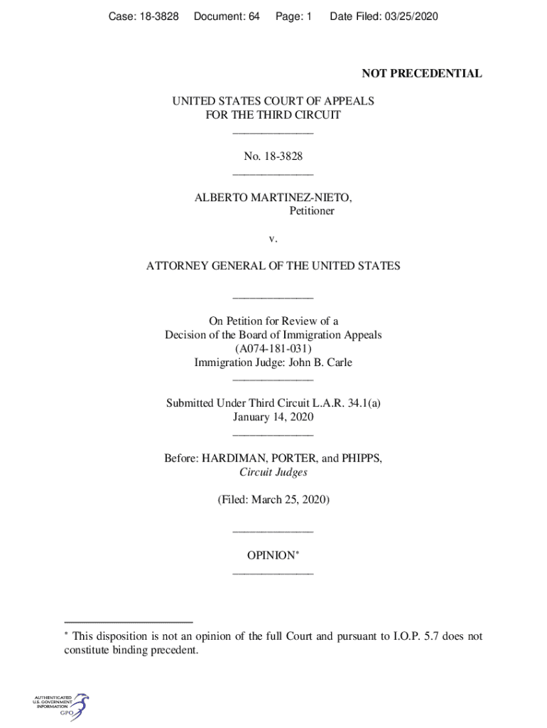 Case: 183828Document: 64Page: 1Date Filed: 03/25/2020NOT PRESIDENTIAL UNITED STATES COURT OF APPEALS FOR THE THIRD CIRCUIT ___ No. 183828 ___ ALBERTO MARTINEZNIETO, Petitioner v. ATTORNEY GENERAL