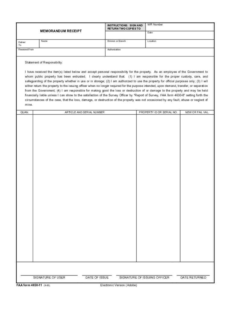 FAA Form 4650-11 memorandum can be filled out electronically or manually following the instructions provided by the FAA.
