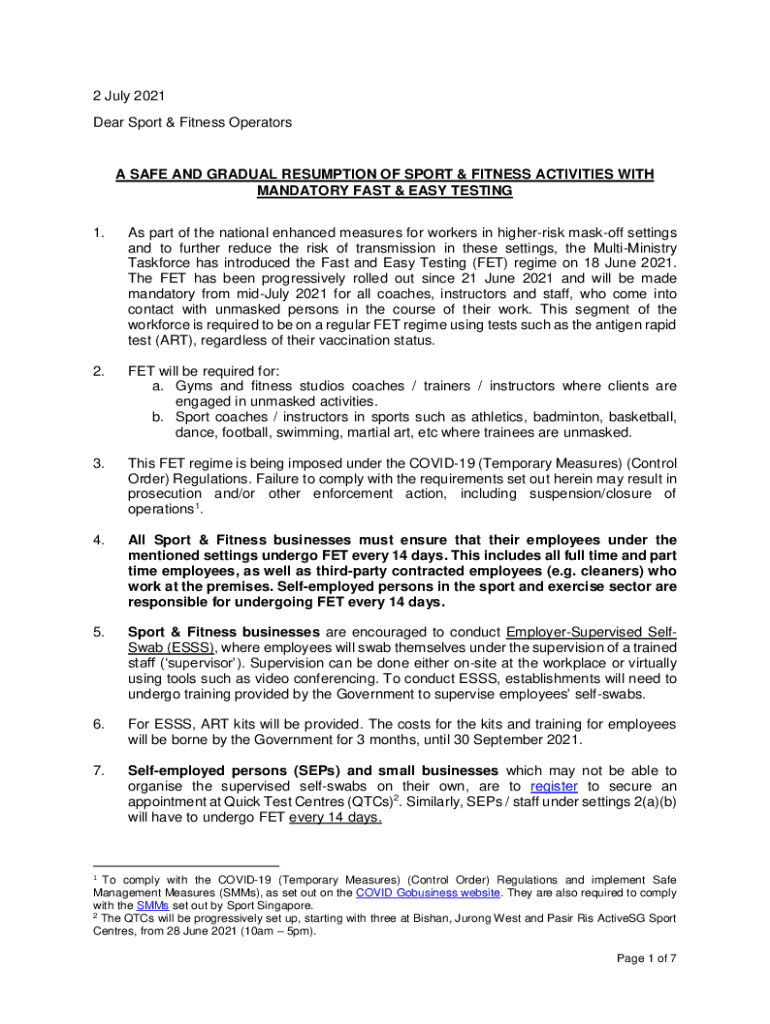 2 July 2021 Dear Sport & Fitness Operators SAFE AND GRADUAL RESUMPTION OF SPORT & FITNESS ACTIVITIES WITH MANDATORY FAST & EASY TESTING 1. As part of the national enhanced measures for workers in