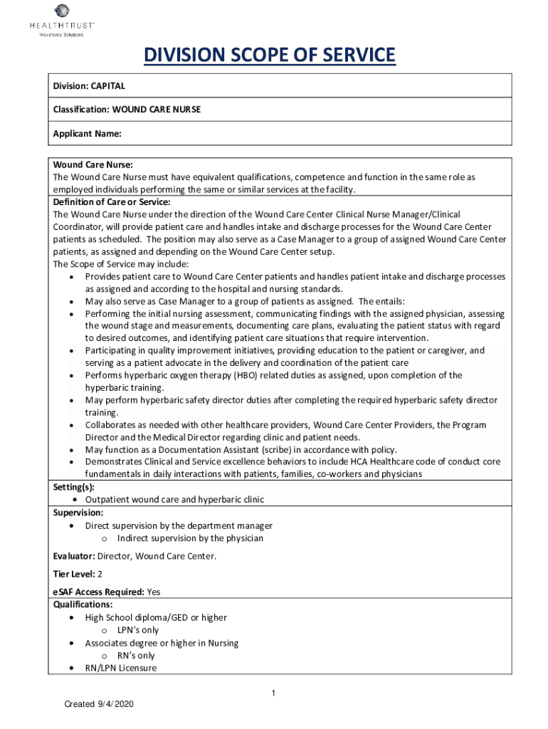 DIVISION SCOPE OF SERVICE Division: CAPITAL Classification: WOUND CARE NURSE Applicant Name: Wound Care Nurse: The Wound Care Nurse must have equivalent qualifications, competence and function in