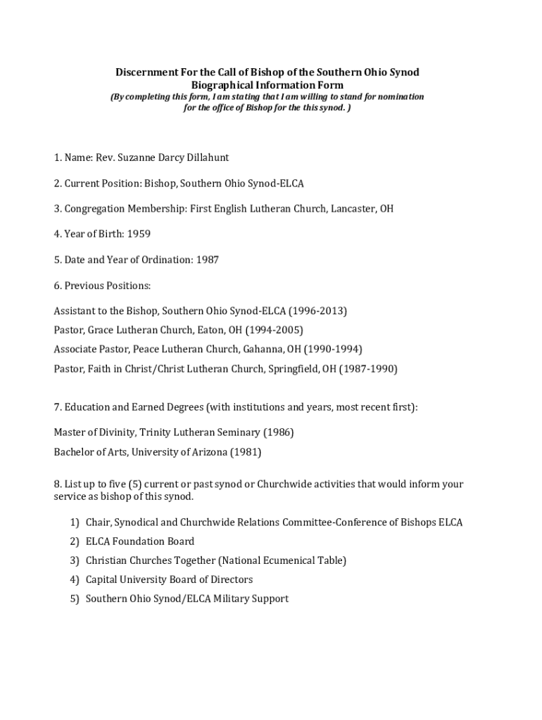 Discernment For the Call of Bishop of the Southern Ohio SynodBiographical Information Form(By completing this form, I am stating that I am willing to stand for nomination for the office of Bishop