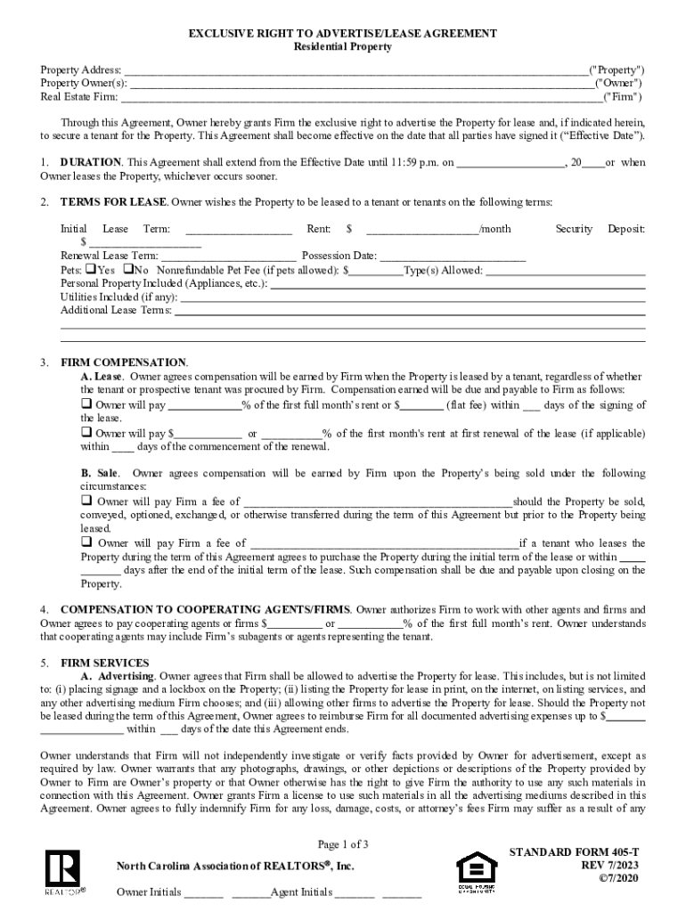 EXCLUSIVE RIGHT TO ADVERTISE/LEASE AGREEMENT Residential Property Address: ___(\” Property\”) Property Owner(s): ___(\” Owner\”) Real Estate Firm: ___(\” Firm\”) Through this Agreement,