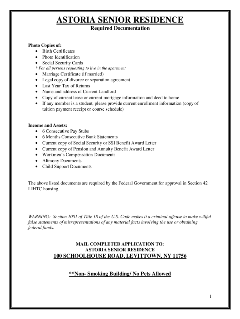 ASTORIA SENIOR RESIDENCE Required Documentation Photo Copies of: Birth Certificates Photo Identification Social Security Cards * For all persons requesting to live in the apartment Marriage Certificate