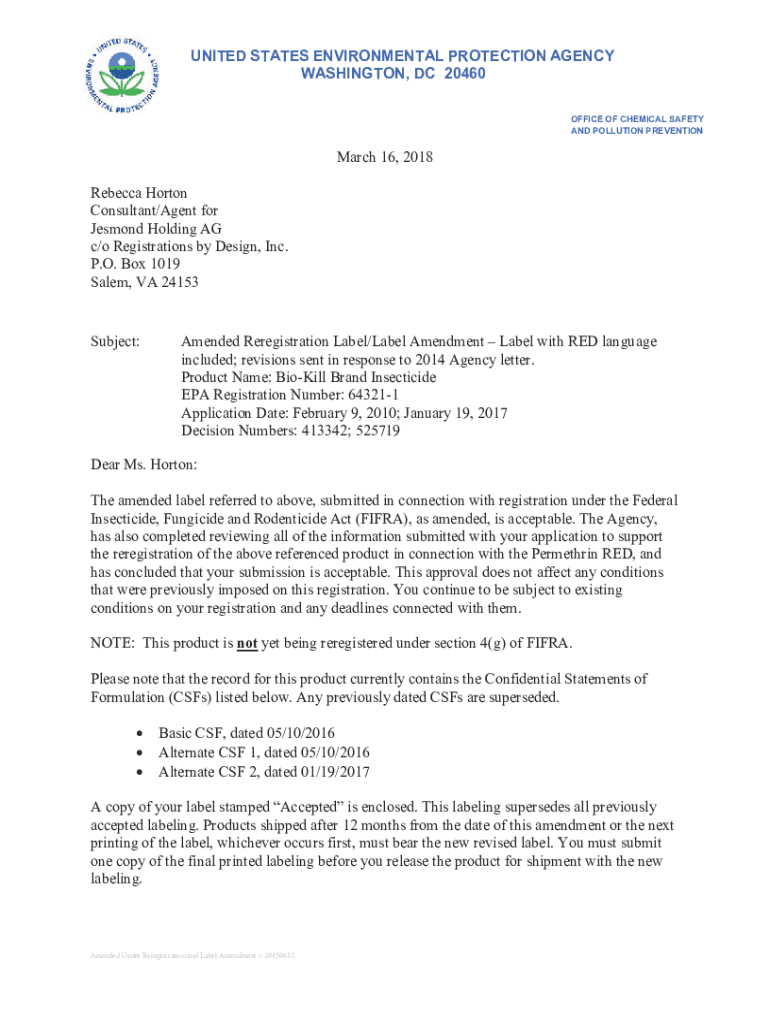 UNITED STATES ENVIRONMENTAL PROTECTION AGENCY WASHINGTON, DC 20460 OFFICE OF CHEMICAL SAFETY AND POLLUTION PREVENTION March 16, 2018, Rebecca Horton Consultant/Agent for Desmond Holding AG c/o Registrations
