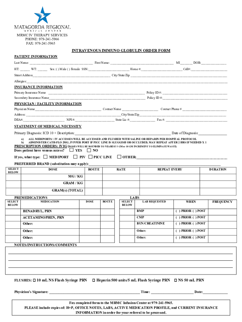 RMC IV THERAPY SERVICES PHONE: 9792415966 FAX: 9792415965INTRAVENOUS IMMUNE GLOBULIN ORDER FORM PATIENT INFORMATION Last Name: ___ First Name: ___ MI___ DOB:___ HT: ___ WT: ___ Sex :() Male () Female