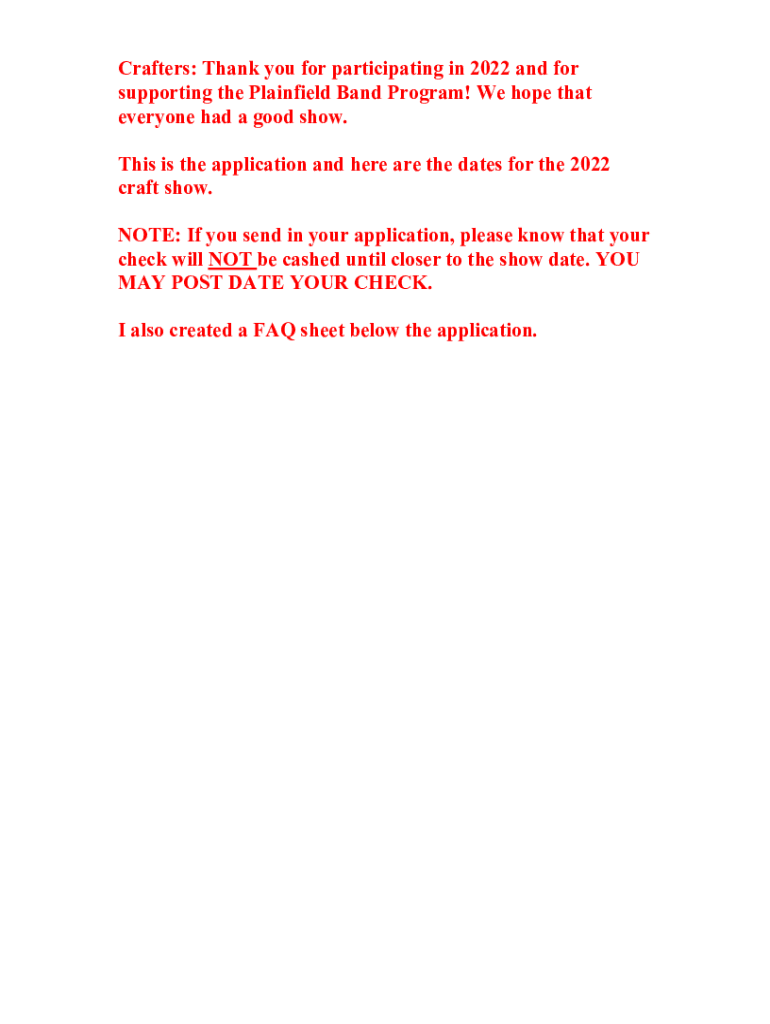 Craters: Thank you for participating in 2022 and for supporting the Plainfield Band Program! We hope that everyone had a good show. This is the application and here are the dates for the 2022 craft