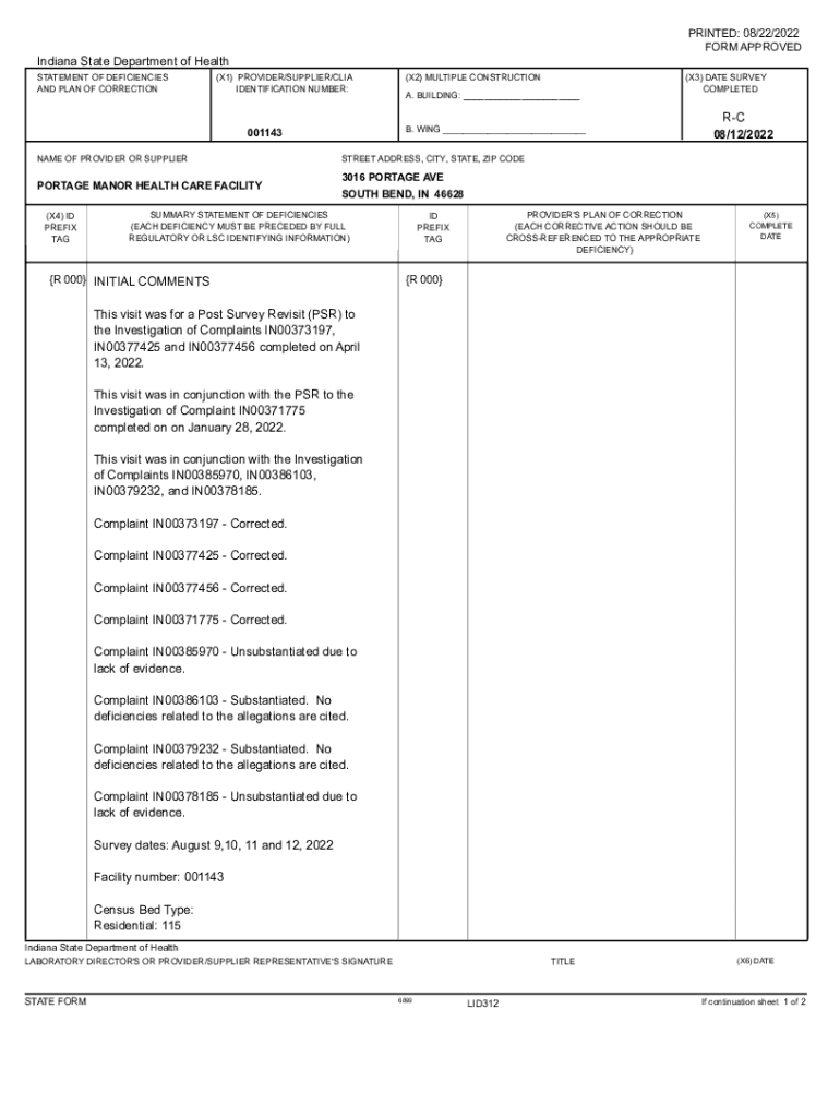 PRINTED: 08/22/2022 FORM APPROVED Indiana State Department of Health STATEMENT OF DEFICIENCIES AND PLAN OF CORRECTION(X1) PROVIDER/SUPPLIER/CIA IDENTIFICATION NUMBER:PORTAGE MANOR HEALTH CARE FACILITY