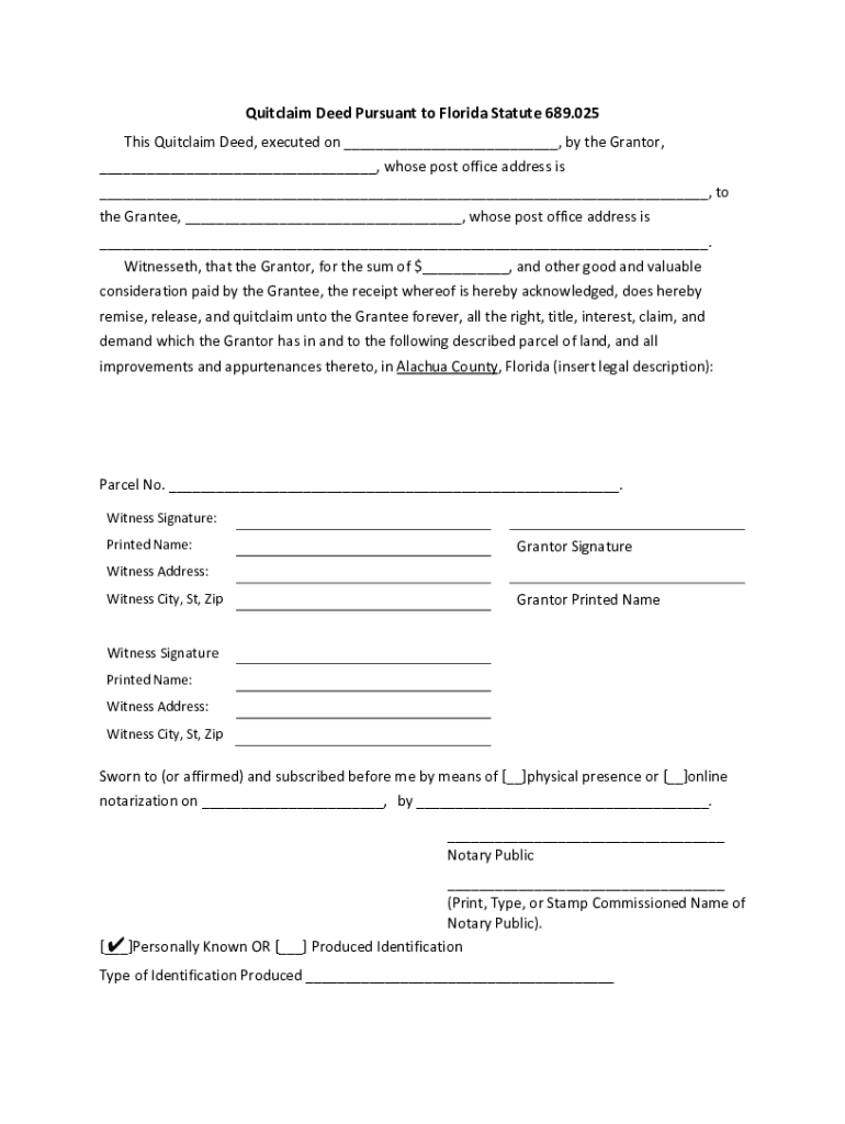 QUITCLAIM DEED DISCLAIMER The attached quitclaim deed form is a type of deed form provided in section 689.025, Florida Statutes. USE THIS FORM AT YOUR OWN RISK Every property transaction is different