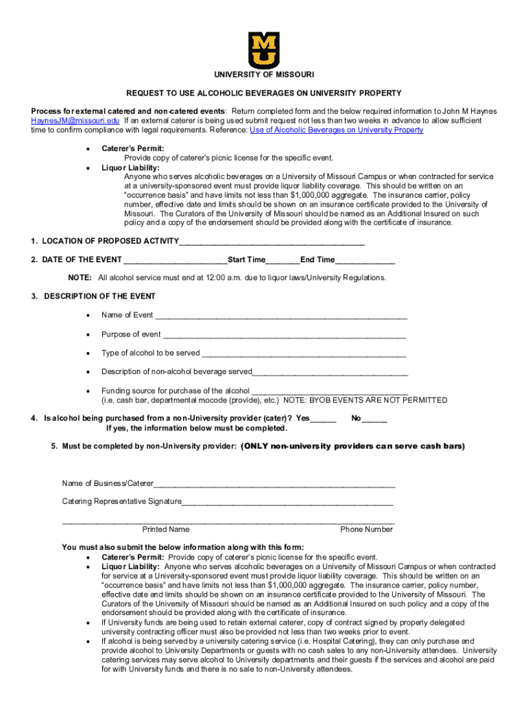UNIVERSITY OF MISSOURI REQUEST TO USE ALCOHOLIC BEVERAGES ON UNIVERSITY PROPERTY Process for external catered and noncatered events: Return completed form and the below required information to John