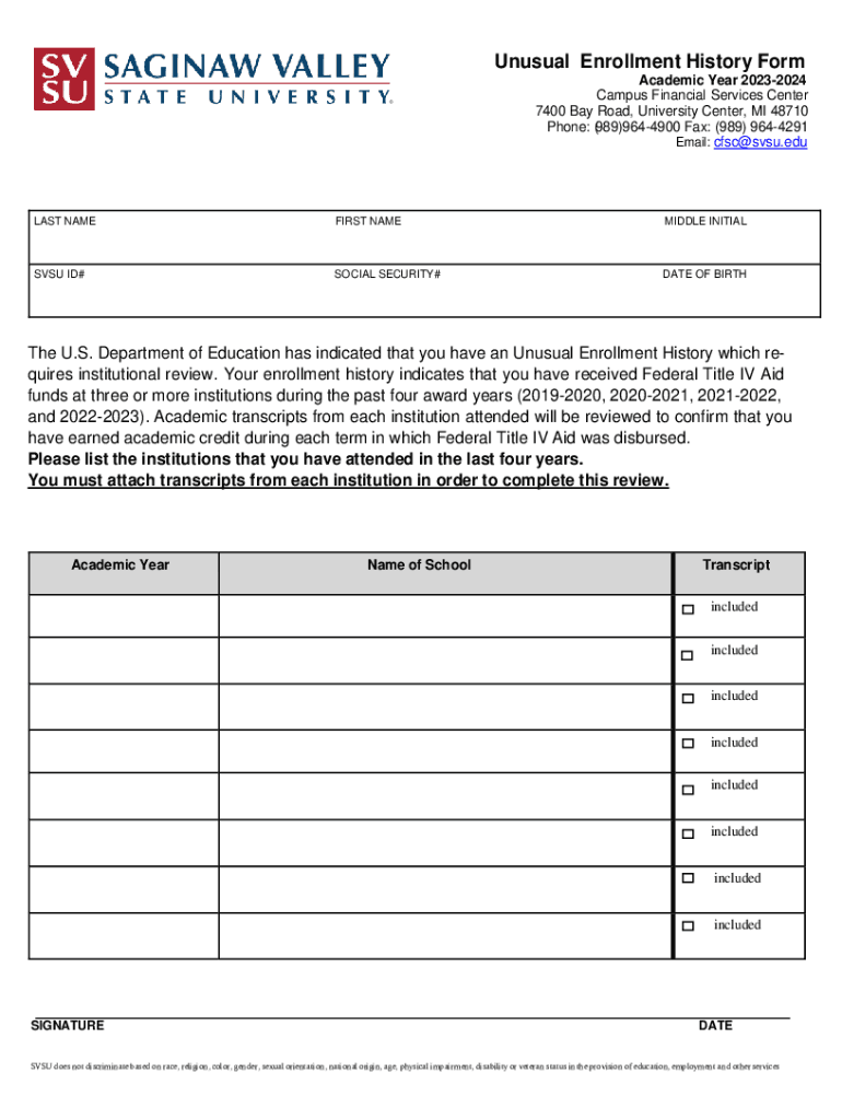 Unusual Enrollment History Form Academic Year 20232024 Campus Financial Services Center 7400 Bay Road, University Center, MI 48710 Phone: (989)9644900 Fax: (989) 9644291 Email: cfsc@svsu.eduLAST NAMEFIRST