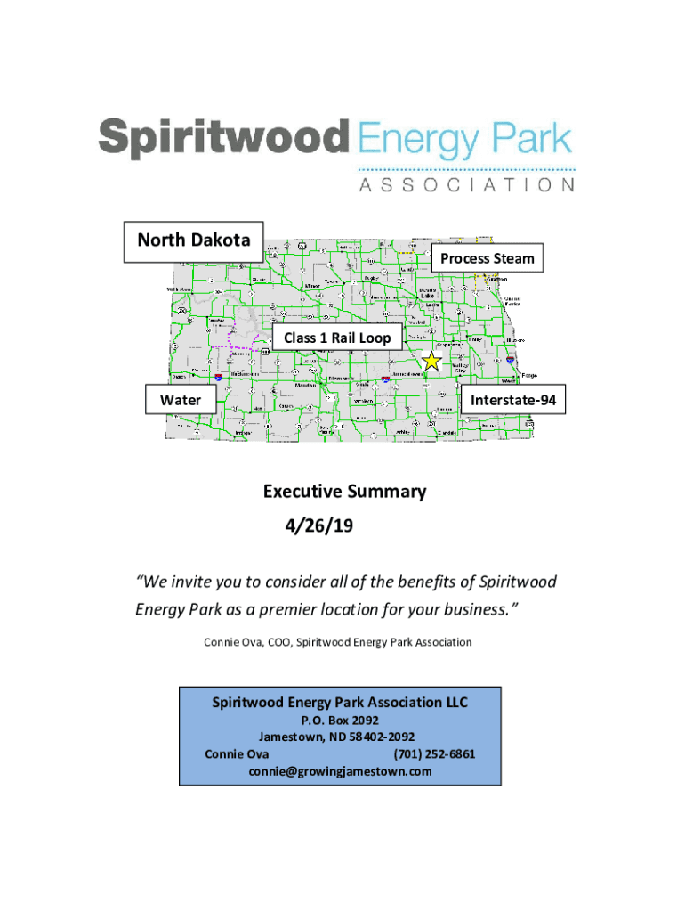 North DakotaProcess Seamless 1 Rail LoopWaterInterstate94Executive Summary 4/26/19 We invite you to consider all the benefits of Spirit wood Energy Park as a premier location for your business. Connie